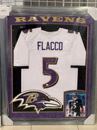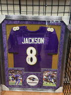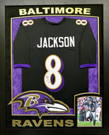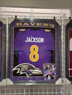 Baltimore Ravens Lamar Jackson Hand Signed Autographed Custom Purple Jersey Framed with Suede Matting, XL 3D Logo, & Cutout Lettering Includes JSA COA
