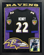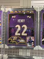 Baltimore Ravens Derrick Henry Hand Signed Autographed Custom Purple Jersey Framed with Suede Matting, XL 3D Logo, & Cutout Lettering Includes Beckett COA