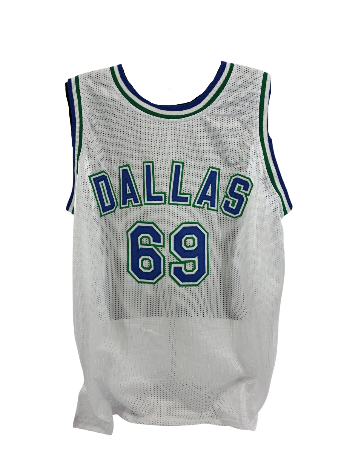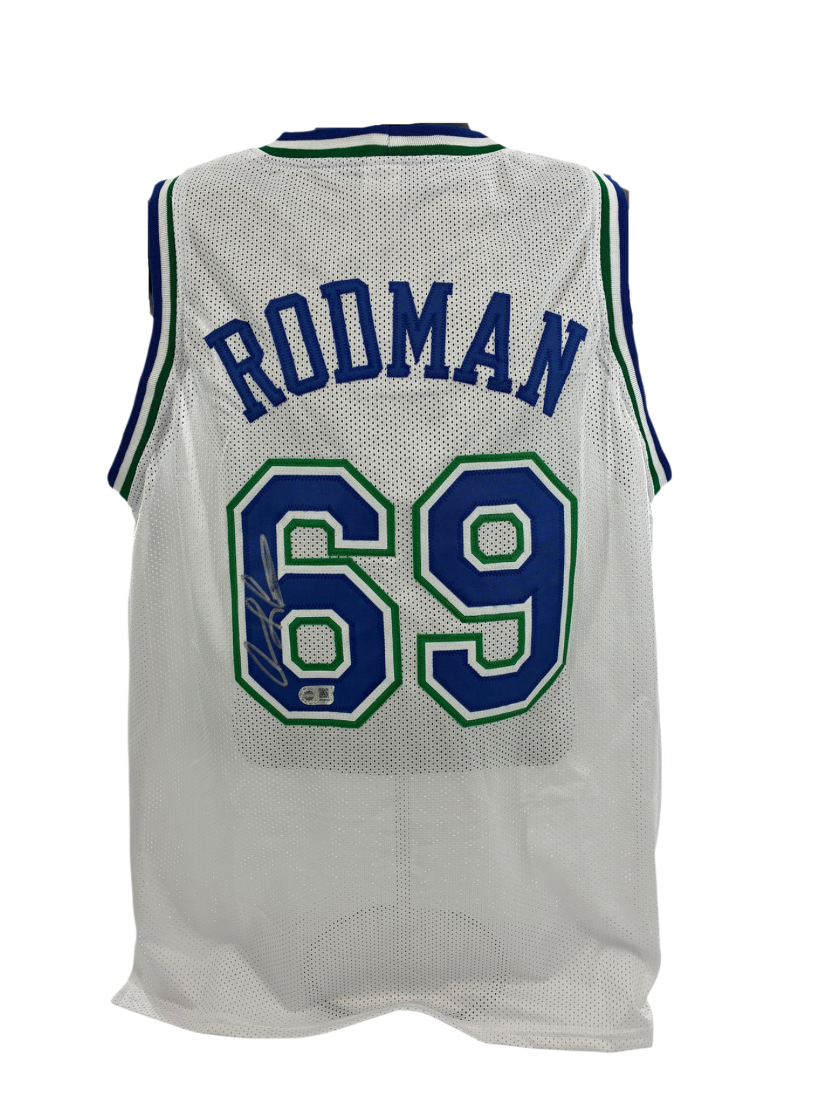 The product is a custom Dallas Mavericks jersey signed by Dennis Rodman, authenticated by SWAU. This collectible item is a true original autograph, making it highly valuable for basketball fans and collectors. The jersey serves as a tangible piece of sports history, showcasing Rodman's signature and connection to the NBA team he once played for. Perfect for showcasing team pride or adding to a fan's memorabilia collection, this autographed jersey holds sentimental and monetary value for fans of the sport.