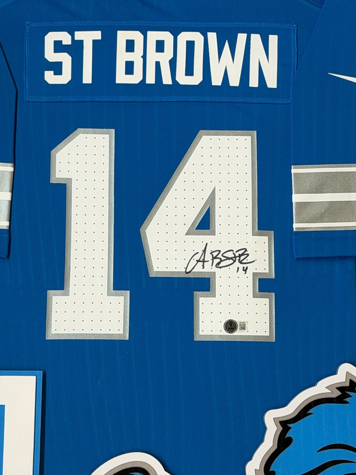 The Amon-Ra St. Brown Lions Custom Framed Jersey is a highly collectible item for fans of the Detroit Lions and football enthusiasts. This autographed jersey, signed by the player himself, comes with a Beckett COA, providing authenticity and assurance of its originality. The framing adds a touch of elegance and makes it a standout piece in any sports memorabilia collection. Perfect for displaying in a home, office, or sports bar, this jersey is a must-have for fans of Amon-Ra St. Brown and the NFL.