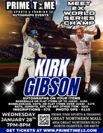 Pre-Sale tickets to get a photo with or your item autographed by MLB Legend Kirk Gibson at the signing event located at Prime Time Sports & Framing inside Great Northern Mall in North Olmsted, Ohio on Wednesday January 28th from 7:00PM-8:00PM.