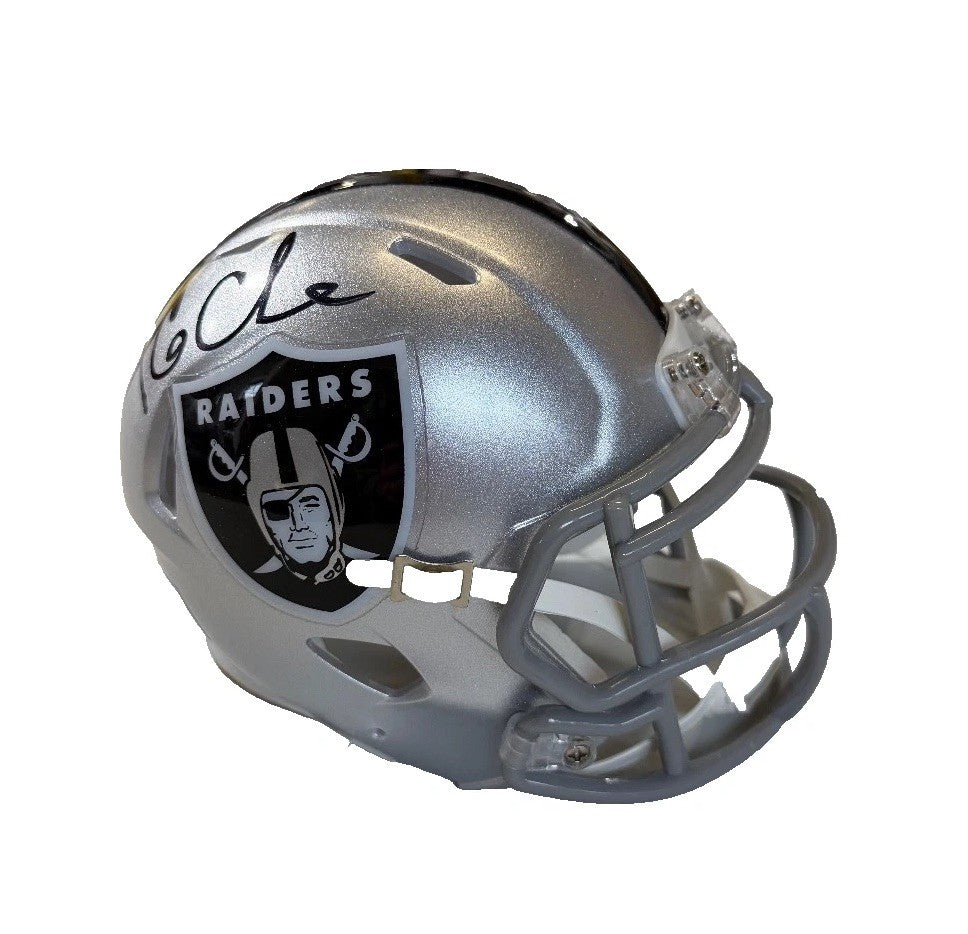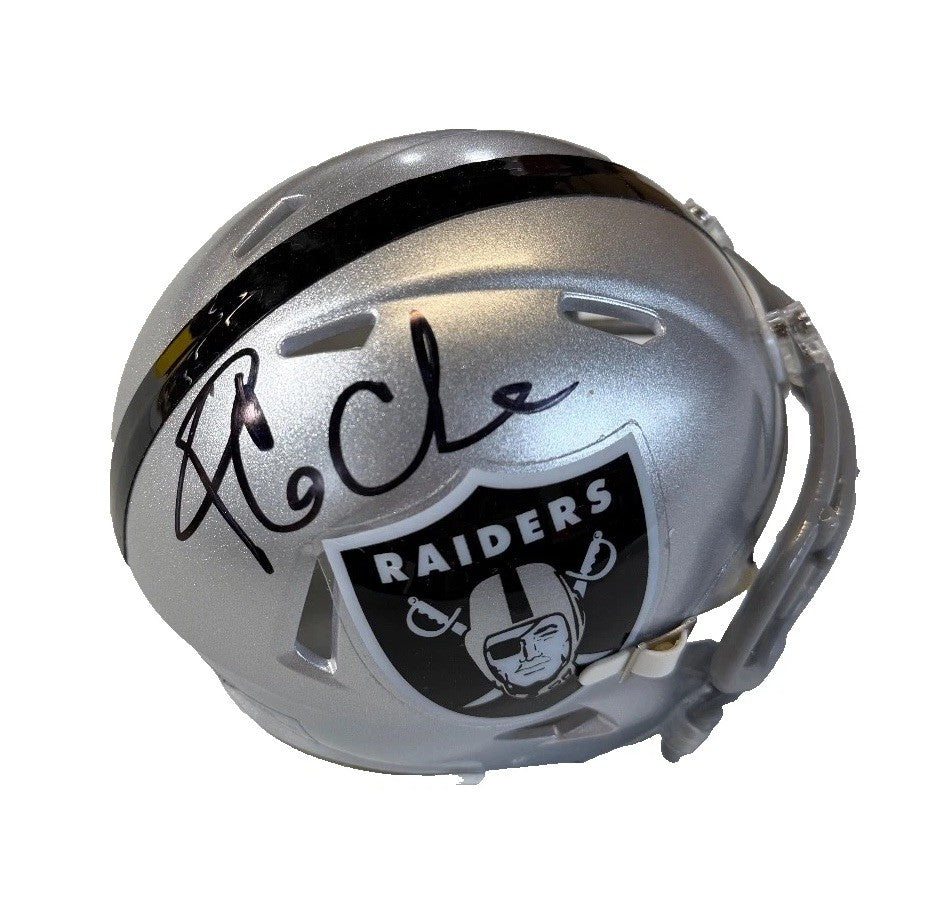 The product is a signed Ice Cube Oakland Raiders mini helmet with authentication from James Spence Authentication (JSA). This collectible item is a unique piece for fans of both Ice Cube and the Oakland Raiders football team. The autographed helmet is an original piece, adding authenticity and value to the item for collectors.