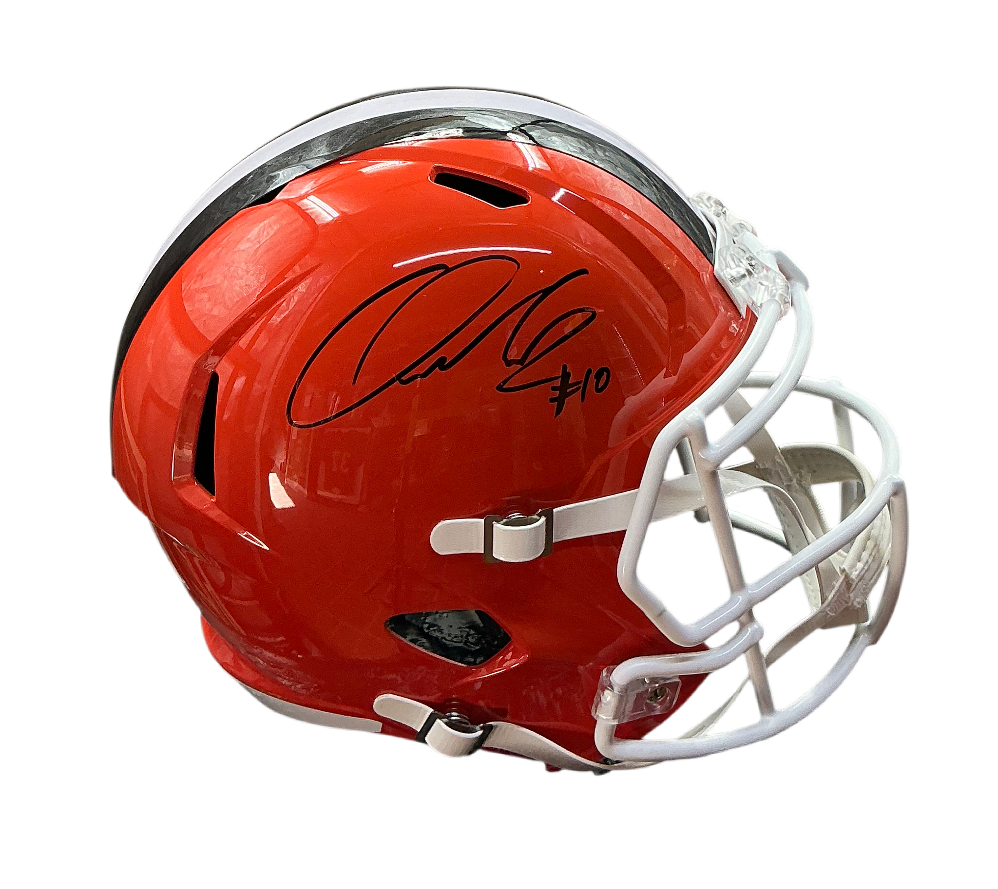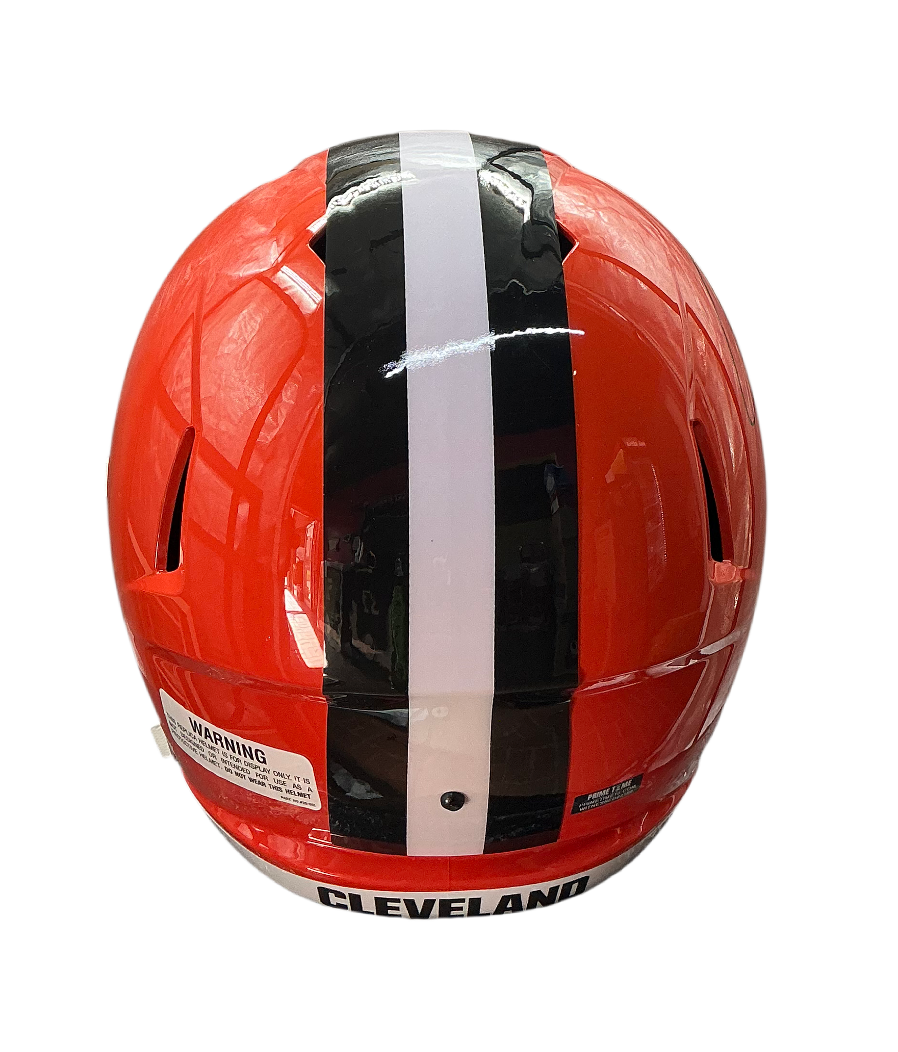 This Cleveland Browns Speed Replica Helmet was signed by Quinshon Judkins with a huge bold signature at our autograph signing event that was held at Great Northern Mall on 10/15/2025. It was witnessed by Beckett and includes a tamper proof hologram that can be looked up on their website to verify authenticity of the autograph.