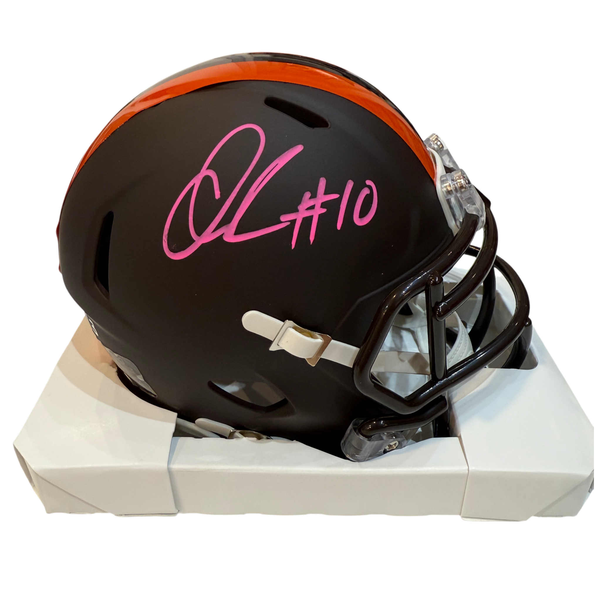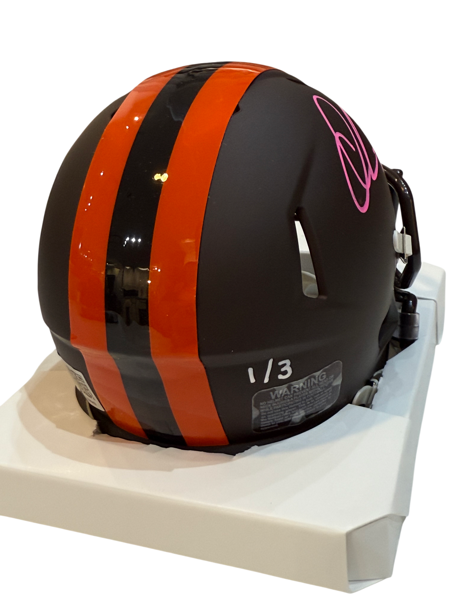 This Cleveland Browns Mini Helmet was signed by Quinshon Judkins with a huge bold signature at our autograph signing event that was held at Great Northern Mall on 10/15/2025. It was witnessed by Beckett and includes a tamper proof hologram that can be looked up on their website to verify authenticity of the autograph.