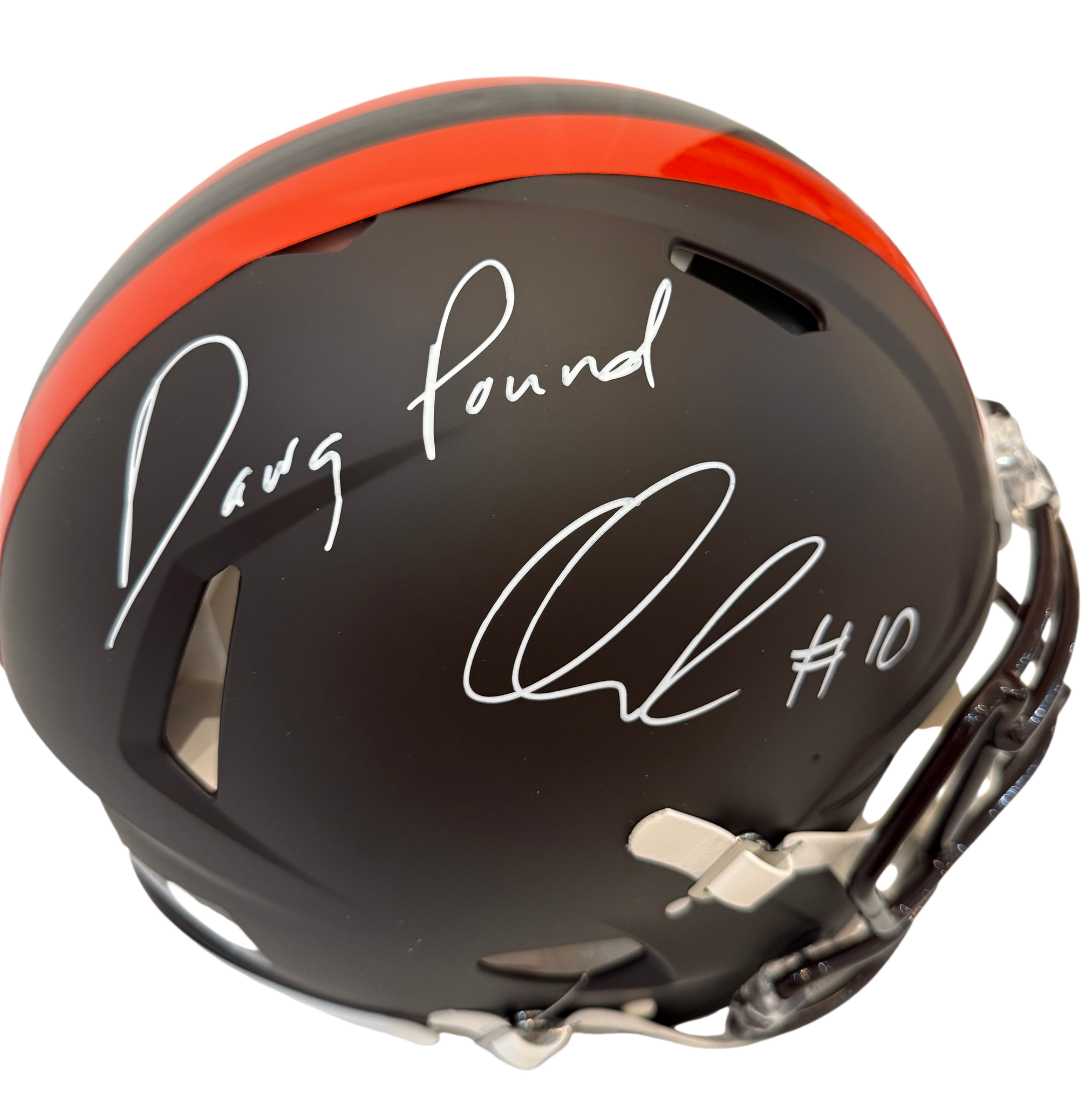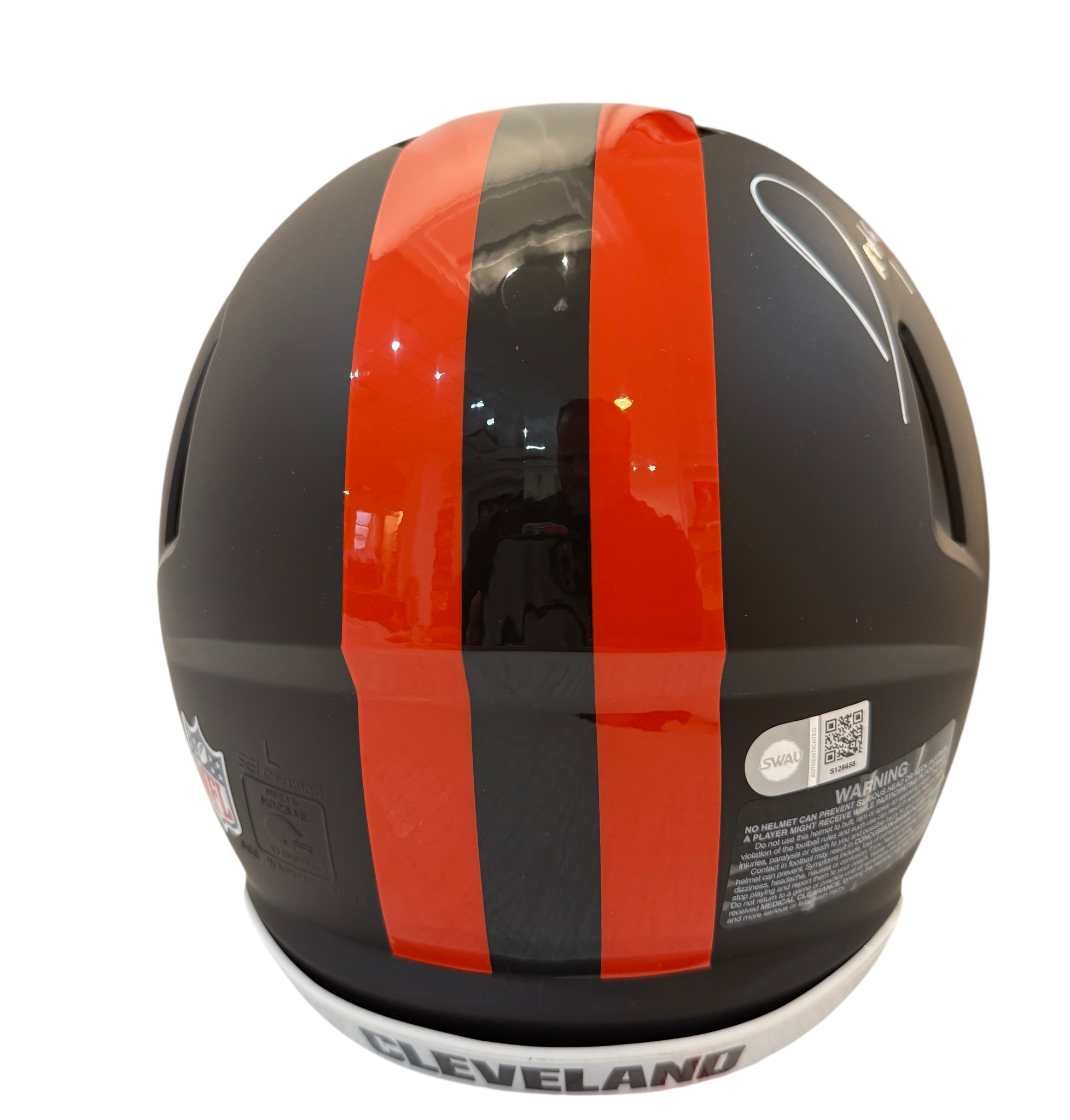 This Cleveland Browns Alpha Dawg Speed Authentic Helmet was signed by Quinshon Judkins with a huge bold signature at our autograph signing event that was held at Great Northern Mall on 10/15/2025. It was witnessed by Swau and includes a tamper proof hologram that can be looked up on their website to verify authenticity of the autograph.