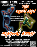 Pre-Sale tickets to get a photo with or your item autographed by NBA Legend Shawn Kemp at the signing event located at Prime Time Sports & Framing inside Great Northern Mall in North Olmsted, Ohio on Saturday January 24th from 6:00PM-7:00PM.