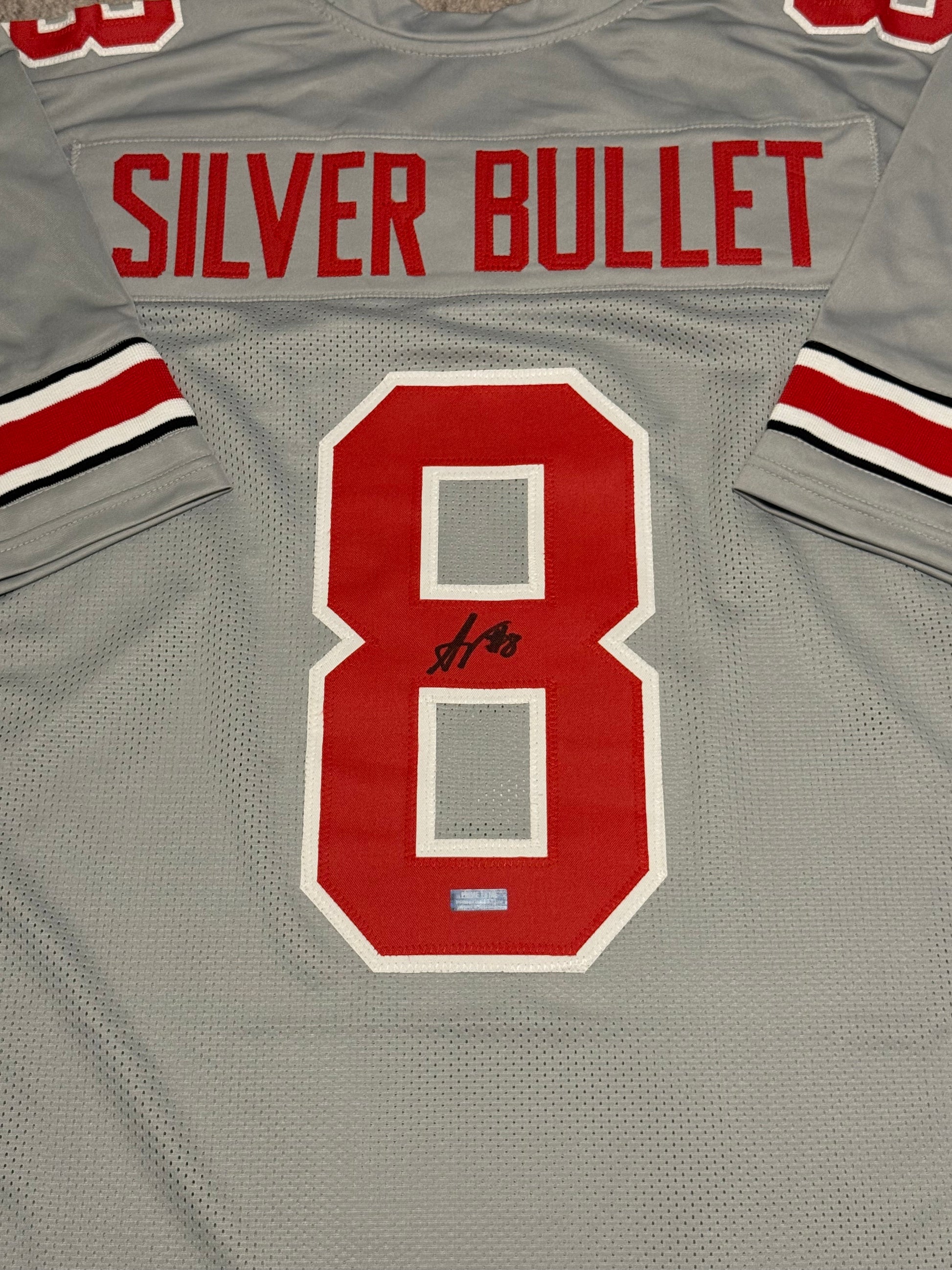 This Ohio State Buckeyes Custom Jersey was signed by Arvell Reese with a huge bold signature at our autograph signing event that was held at Great Northern Mall on 12/13/2025. It was witnessed by Prime Time and includes a tamper proof hologram that can be looked up on their website to verify authenticity of the autograph.