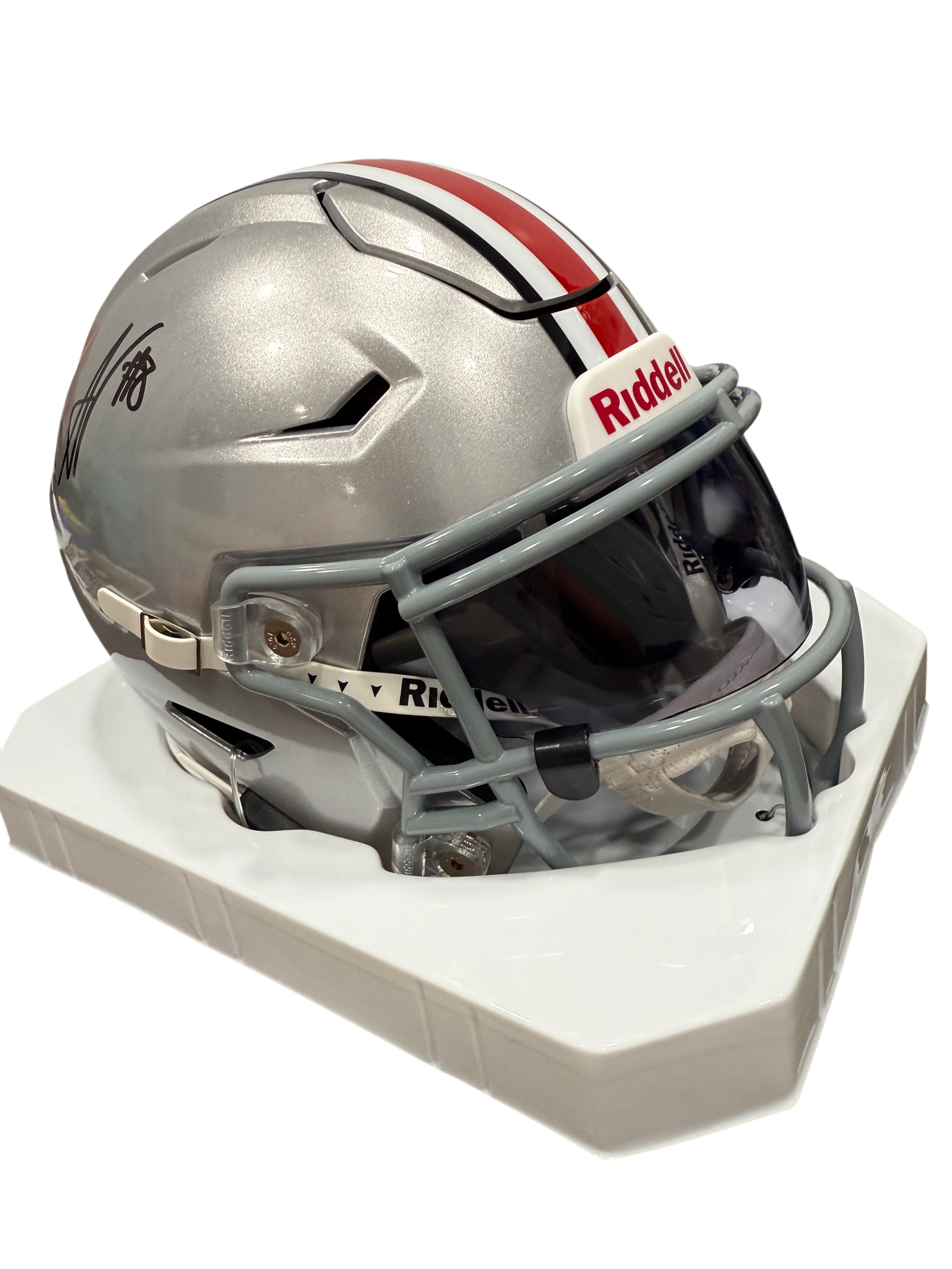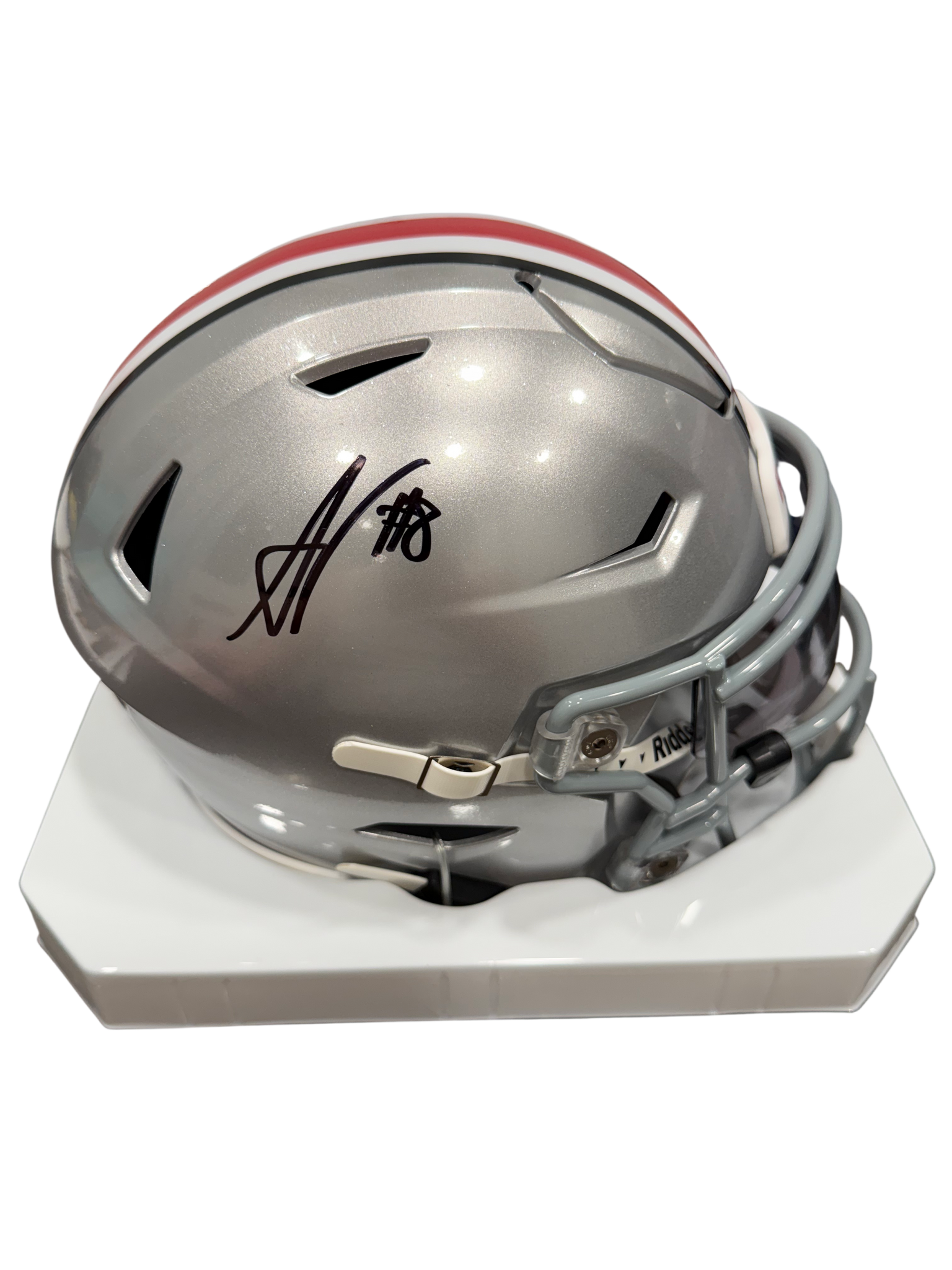 This Ohio State Buckeyes Mini Helmet was signed by Arvell Reese with a huge bold signature at our autograph signing event that was held at Great Northern Mall on 12/13/2025. It was witnessed by Prime Time and includes a tamper proof hologram that can be looked up on their website to verify authenticity of the autograph.