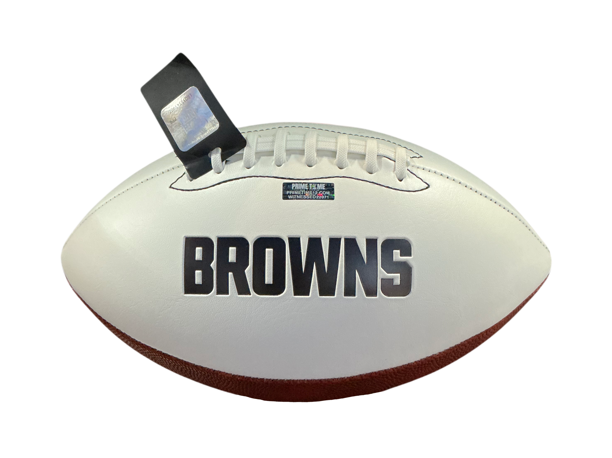 This Cleveland Browns Logo Football was signed by Clay Matthews with a huge bold signature at our autograph signing event that was held at Great Northern Mall on 9/13/2025. It was witnessed by Prime Time Witness authentication and includes a tamper proof hologram that can be looked up on our website to verify authenticity of the autograph.
